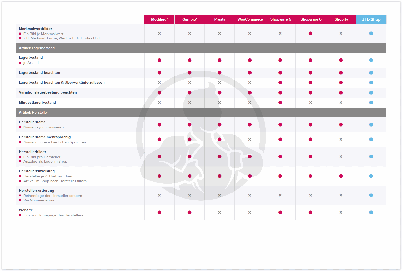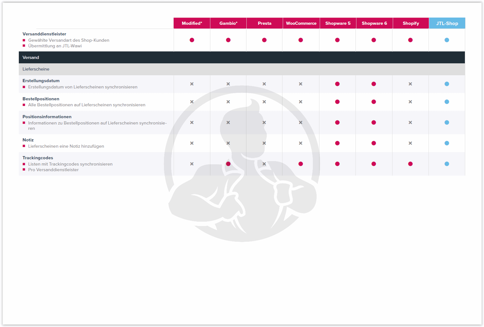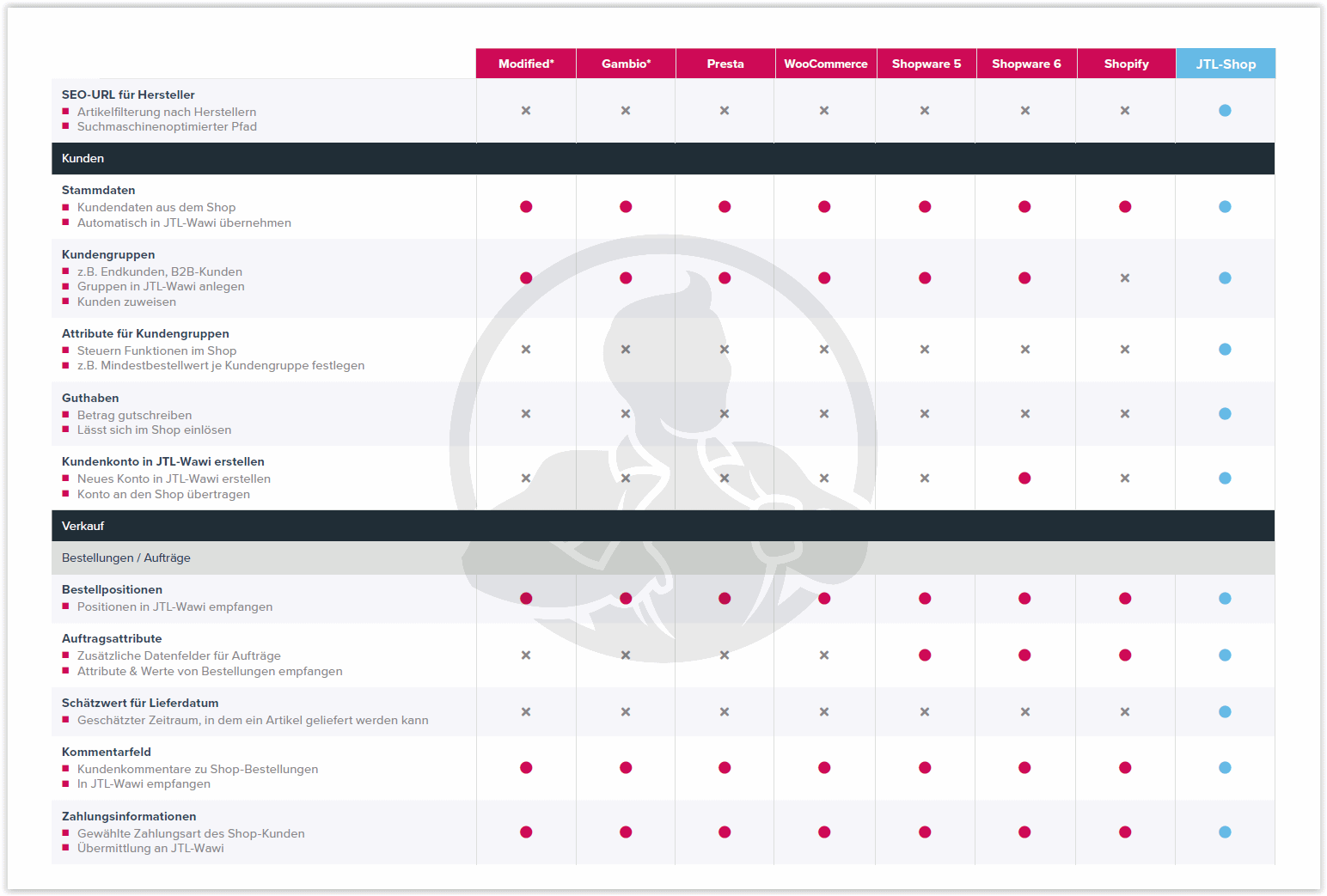 Aber auch Shops anderer Anbieter lassen sich mit Hilfe des kostenlosen JTL-Connectors schnell und einfach mit JTL-Wawi nutzen. Im Einzelnen ist die Anbindung folgender Systeme möglich: Shopify, Shopware 4 & 5, Gambio 3, modified eCommerce2, PrestaShop, WooCommerce 2 & 3
