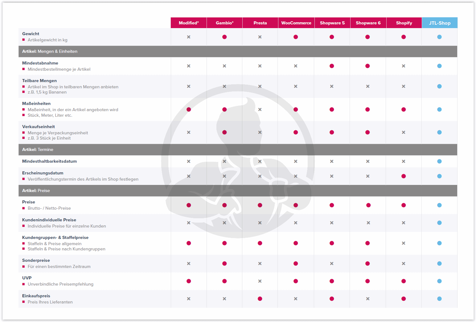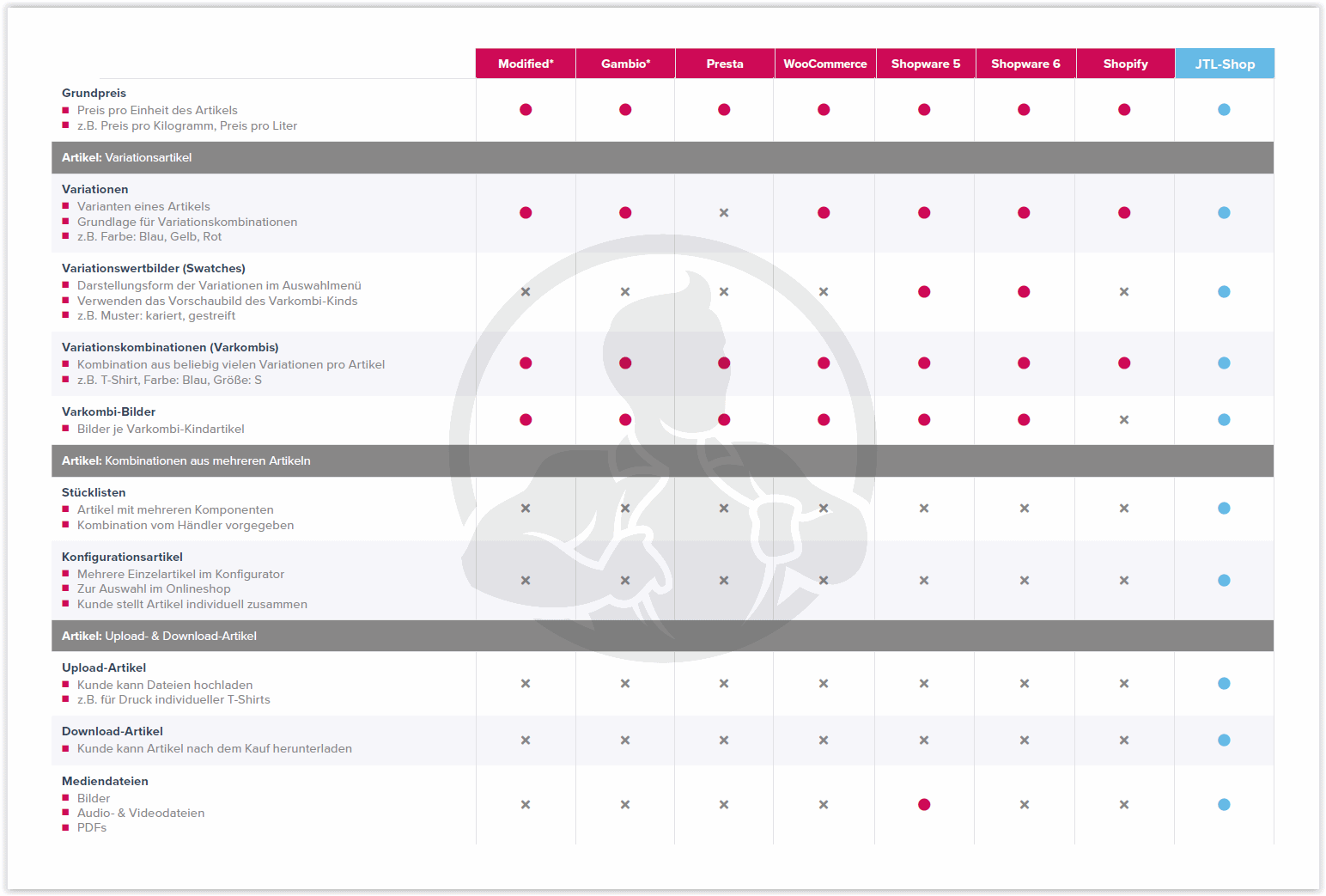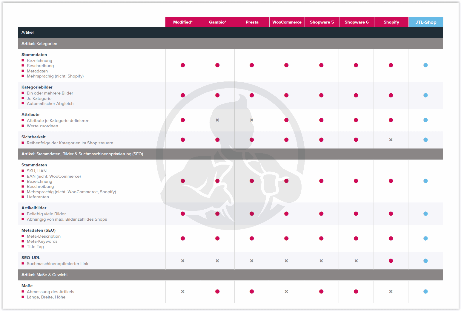 Aber auch Shops anderer Anbieter lassen sich mit Hilfe des kostenlosen JTL-Connectors schnell und einfach mit JTL-Wawi nutzen. Im Einzelnen ist die Anbindung folgender Systeme möglich: Shopify, Shopware 4 & 5, Gambio 3, modified eCommerce2, PrestaShop, WooCommerce 2 & 3